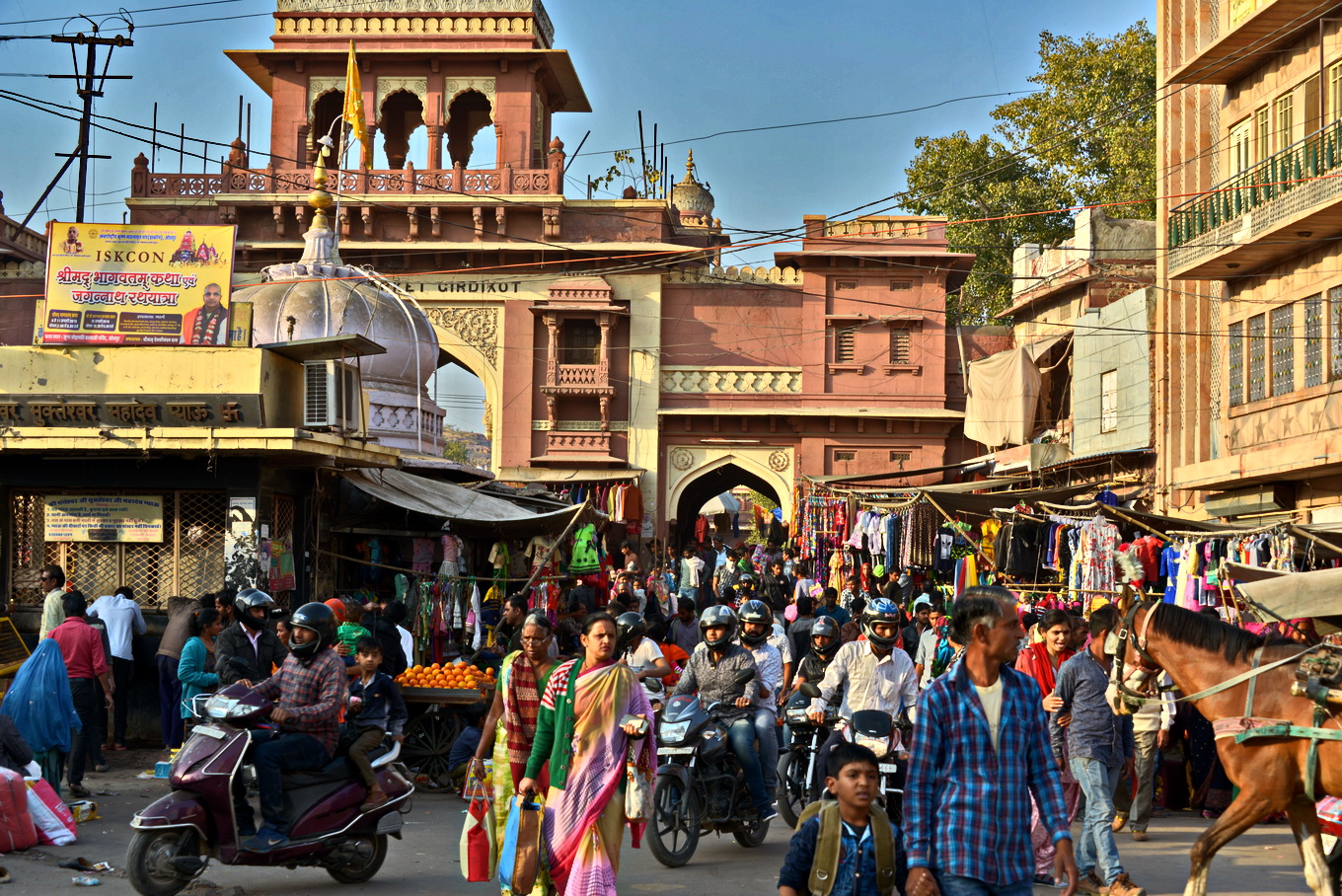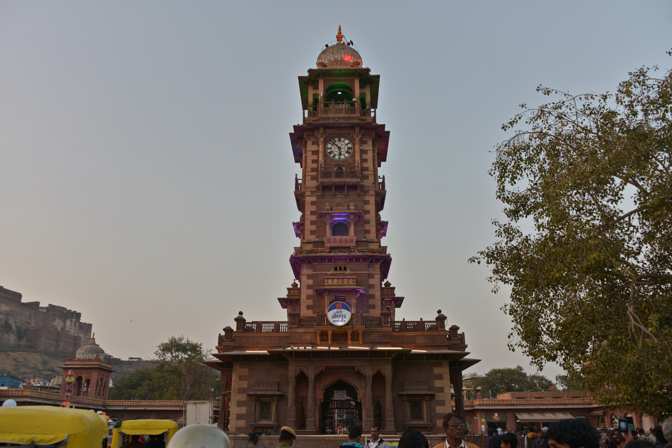 Protéticos, barbeiros, costureiros e vendedores instalados na praça aguardam com paciência indiana por seus clientes. Mulheres também, talvez em maior número, a maioria sentada no chão, vendendo roupas coloridas amontoadas em pequenas pilhas sobre lonas encardidas. Bancas de frutas e frituras nos convidam a saborosas, mas imprudentes experiências gustativas. Ela – a torre e seu relógio inglês -, além das ruas e das pessoas que a circundam, é vigiada mais distante pela imponente, altiva fortaleza de Mehrangarh, que soberba no alto da colina, a tudo regula.