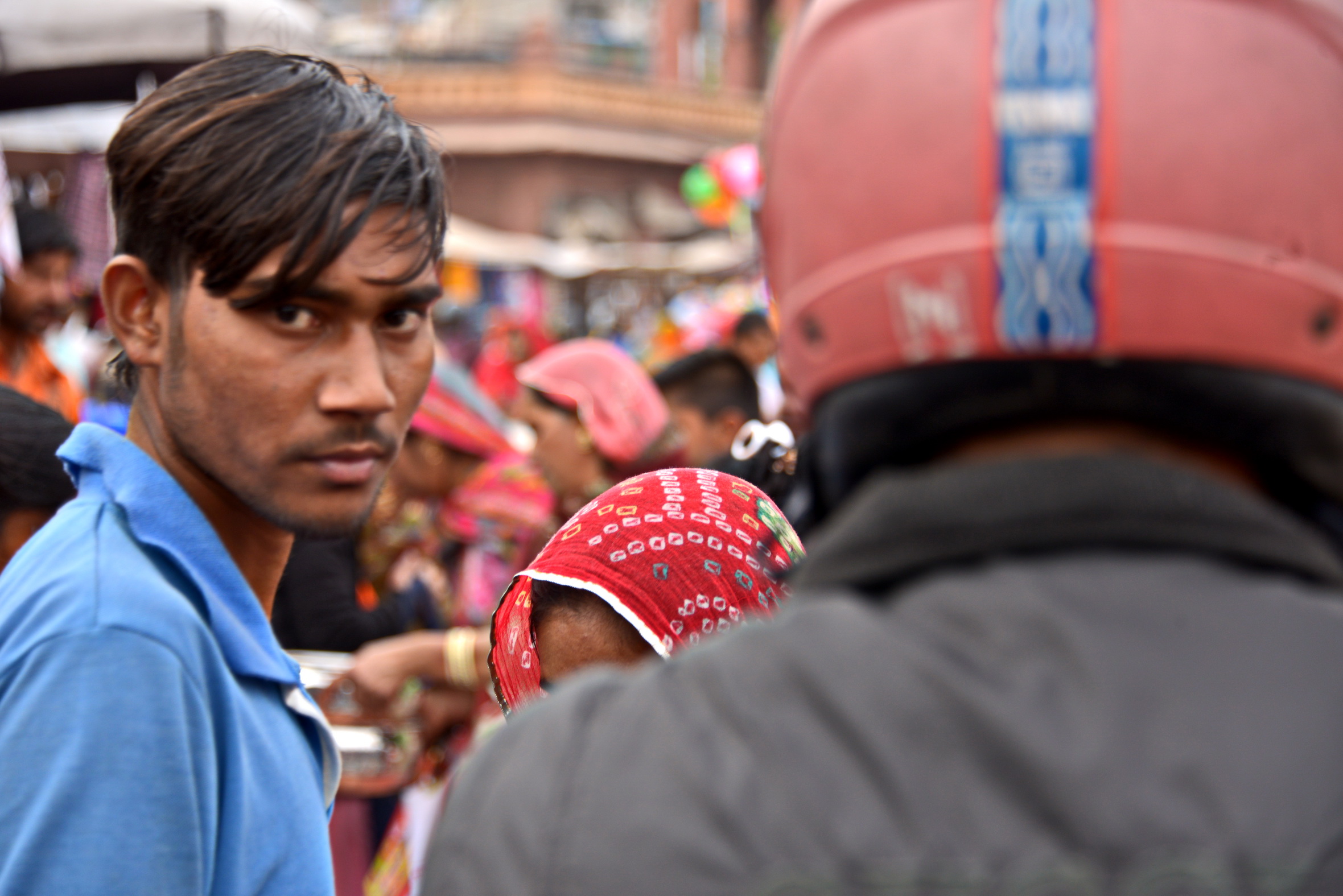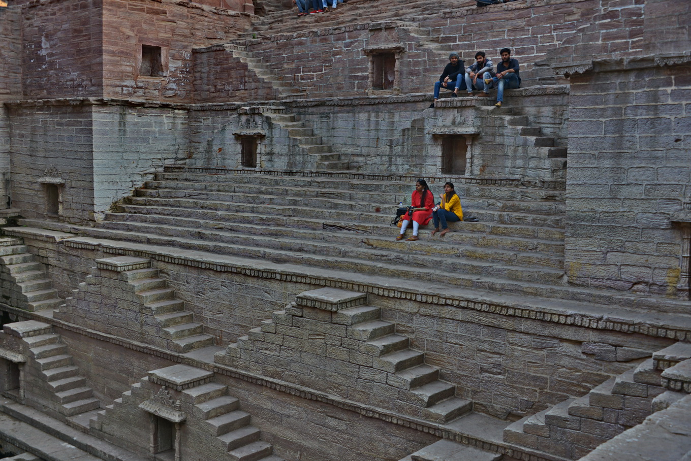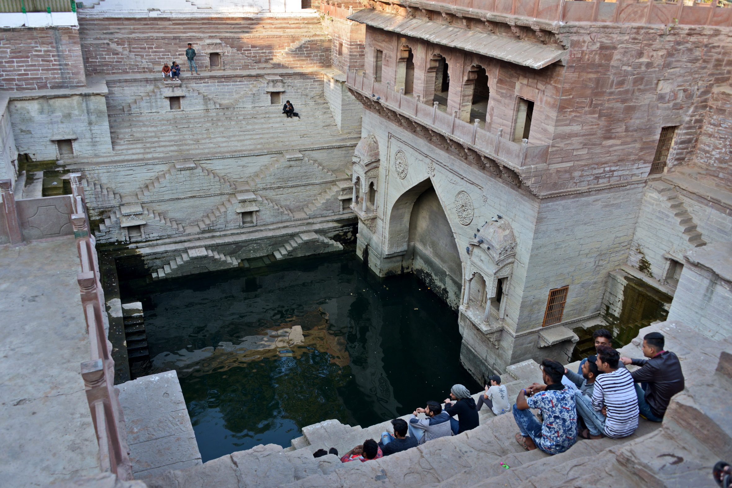 Ainda que pareça de outro planeta, quase uma insanidade coletiva, desorganizado na aparência, o caos que faz sentido e tem funcionalidade se dissipa assim que nos afastamos da praça e saímos dos mercados. Entramos na rua Tunwar ji ka Jhalra e continuamos por becos, até chegarmos a um grande largo onde fica Toorji Ka Jhalra, um suntuoso baoli escondido num canto da cidade velha. Poucos turistas vão até ali, apesar de seus setecentos anos de idade, intermináveis degraus feitos da mesma pedra dos palácios que conduzem a um abismo, profundo e fascinante, com pavilhões e colunas, que o torna uma preciosidade imperdível, cujo desenho intrigante tem padrão repetitivo e harmonioso. Não resisto à vontade e desço alguns degraus. Não chego à profundeza, onde fica a água verde acumulada, mas sinto o frescor. No Verão e nas monções, jovens mergulham dos degraus mais próximos à água e mulheres recolhem água em cacimbas. Observo e fotógrafo, deslumbrado, satisfeito, verdadeiramente realizado por vê-lo e registrá-lo na câmera.