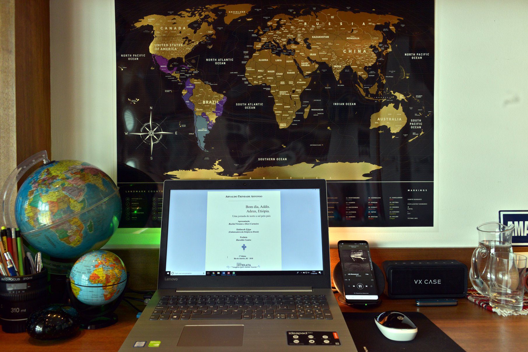 Me rodeiam dois pequenos globos terrestres, blocos de anotações, uma caneca com lápis e canetas que apanhei de hotéis no mundo, um abajur réplica de um Tiffany e um relógio bem moderno com termômetro. Estes dois últimos são os únicos bens que não se relacionam com as viagens. Decoram e servem. No mapa-múndi, acima dos olhos, pinos marcam 65 países. Olho para alguns mais detidamente e me lembro das experiências vividas em cada qual. Não coleciono países, contudo, muito me apraz contar os que já estive e revisitei. A câmera fotográfica também fica por aqui. Vejo-a desgastada por anos de uso, com cicatrizes dos maus tratos por que passou e com marcas de fricção e atrito. Com ela, eu trouxe para casa milhares de pedaços de muitos destinos, souvenirs fotográficos que revelam tanto a minha curiosidade quanto meu jeito de olhar, e hoje ilustram meus livros, este blog e minhas redes sociais. Entregam-me boas lembranças todas estas coisas e, já que ilhado estou, sento-me sabendo que escreverei.