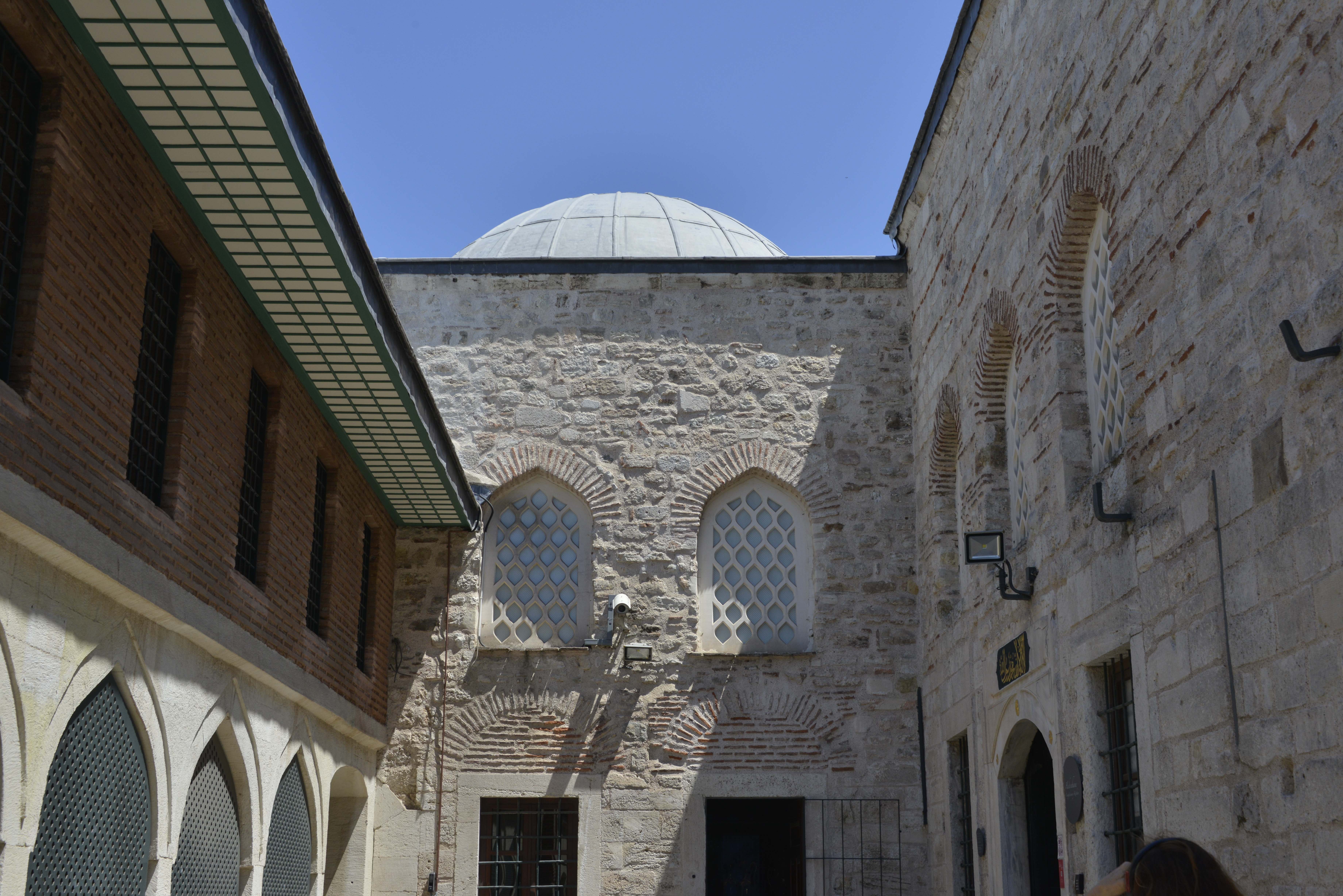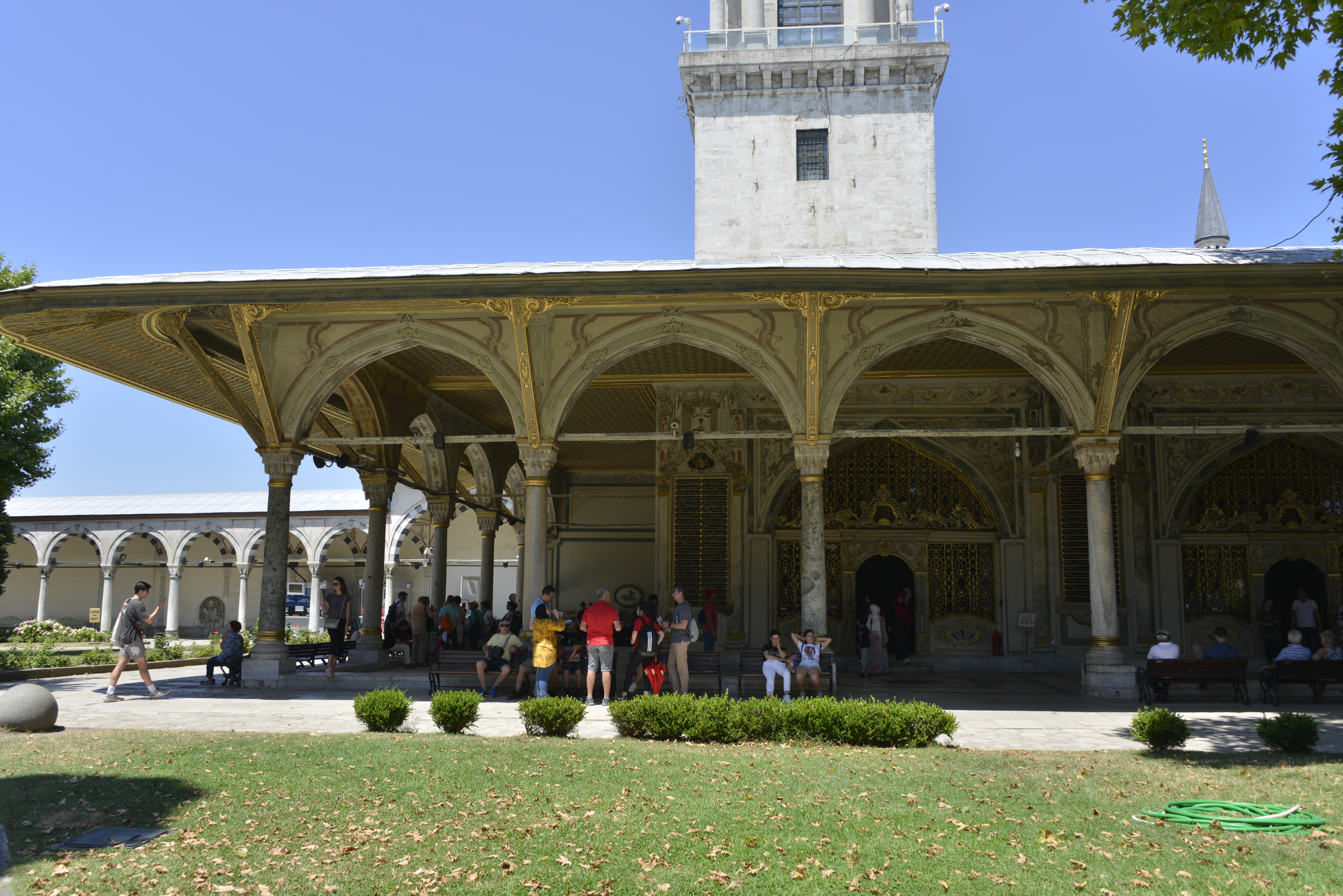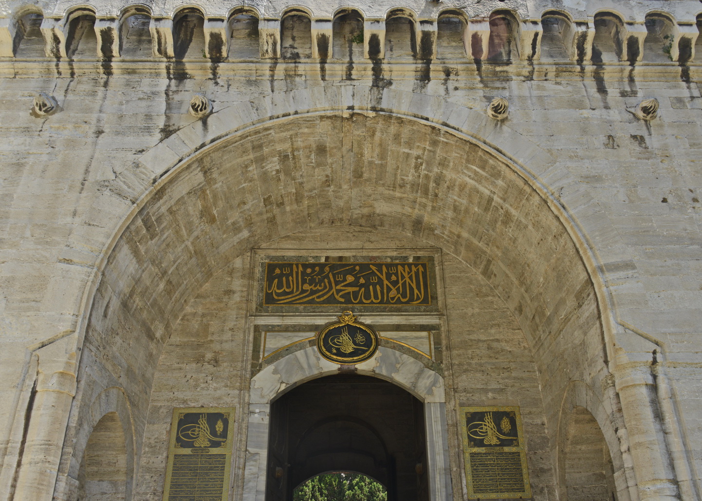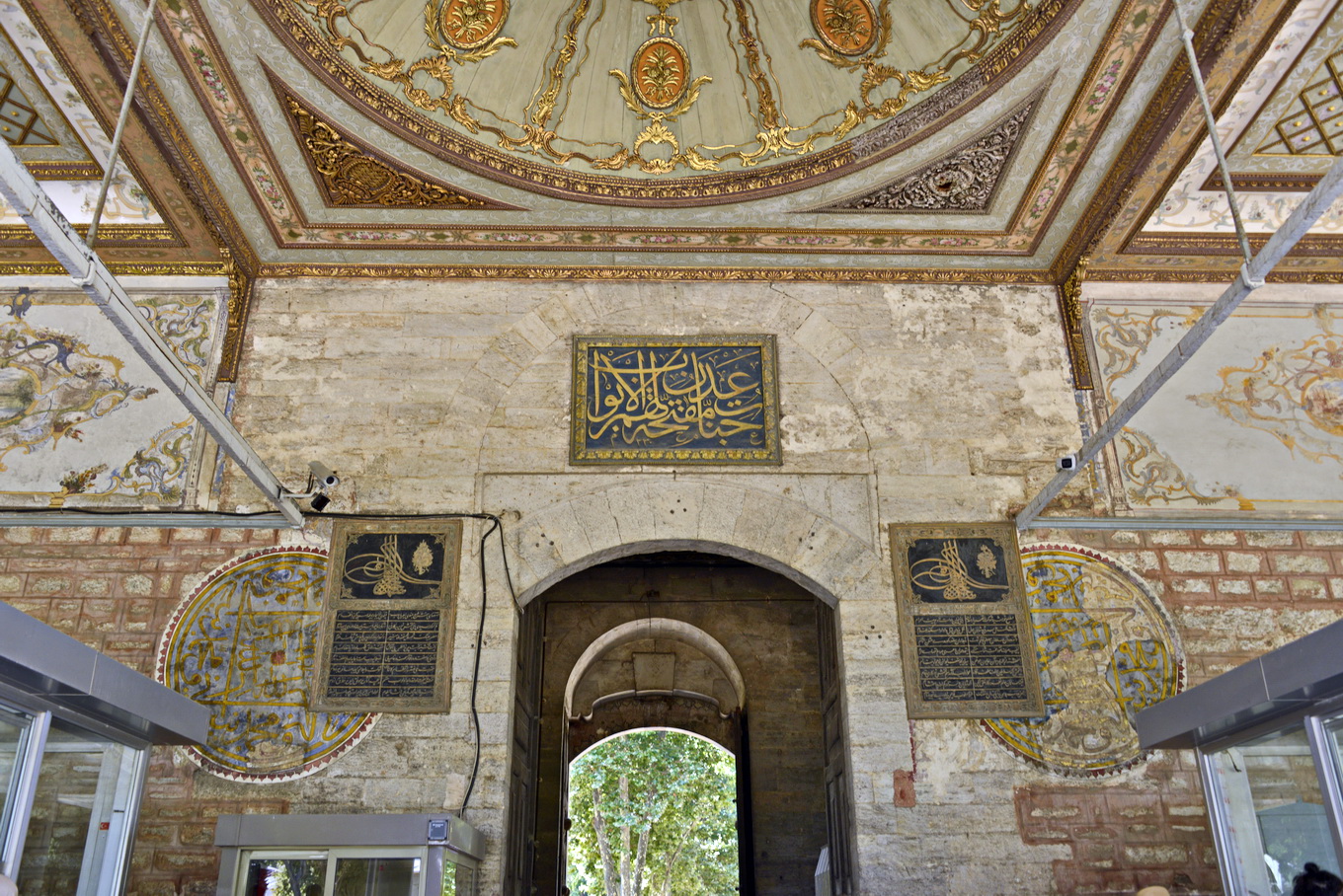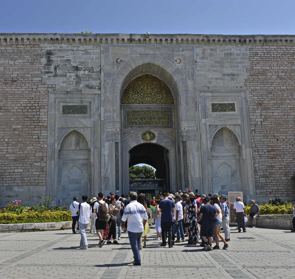 Há três portas: Imperial, da Saudação e da Felicidade. Entramos pela Bâb-ı Humayun[1], ou Porta Imperial, entrada principal do lado da Hagia Sophia quando se faz a caminhada por trás do templo, desde o Hipódromo, pela Soğukçeşme Sokağı, a Rua da Fonte Fria. Saindo dela, chega-se ao largo onde domina a Fonte de Ahmet III,arquitetonicamente uma estrutura em estilo rococó turco, de 1728 – quando caracterizavam-se pela predominância de linhas circulares, ondulantes e curvas – no estilo do período tulipa, assim chamado ao emprego profuso da flor nacional nas ornamentações.