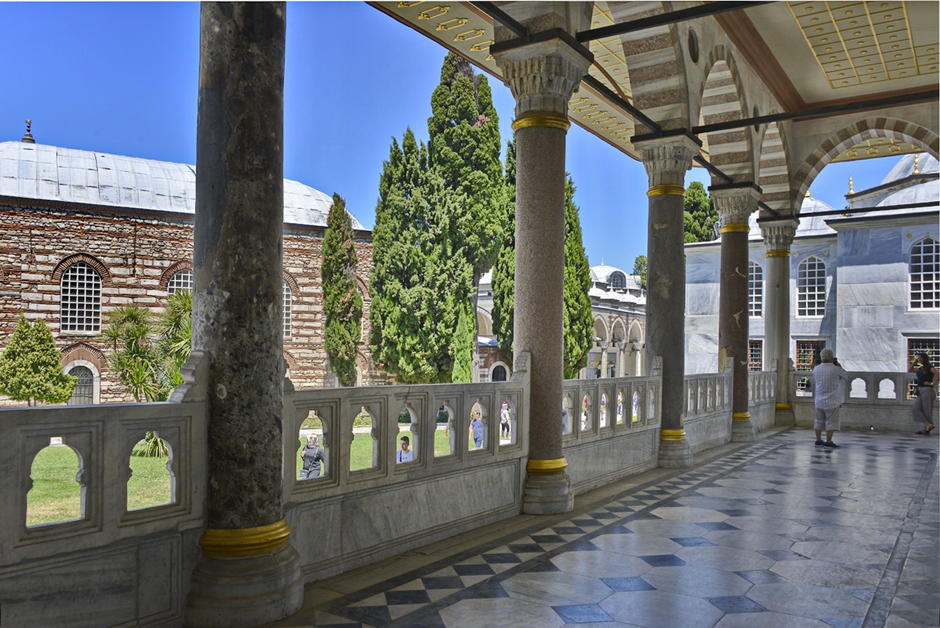 Logo à esquerda, já cruzado o portão, há um bonito alpendre oriental com lojas de lembranças turísticas de Istambul e do palácio. A seguir, a Cozinha do Palácio, minha parte preferida do complexo, à direita do segundo pátio. A falta de interesse pela cozinha monumental, todavia, faz boa parte dos visitantes que pouco ou nada perderam, embora os 20 fornos e tudo mais sejam um ponto a não perdes, maravilha arquitetônica com respeitável coleção de cerâmicas de Iznik, da Pérsica, da China e do Japão, a terceira maior do mundo, com cerca de 12 mil peças, entre elas algumas chinesas da época da Rota da Seda.
