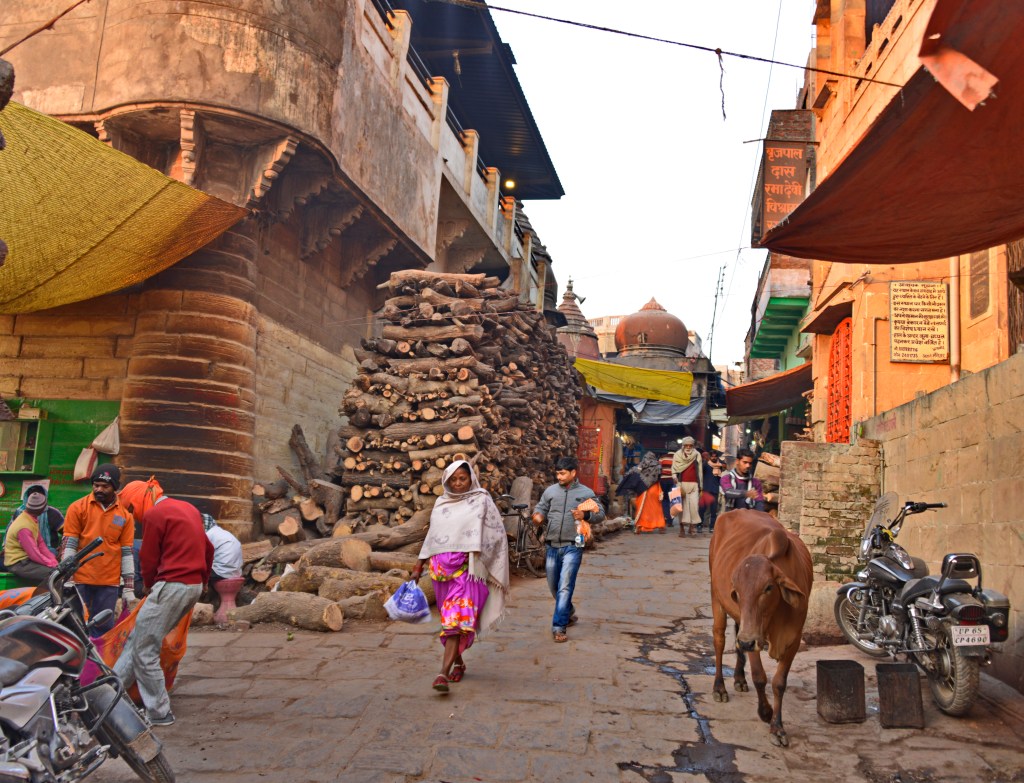 Na manhã seguinte, com o dia a Sol raiado, voltamos ao mesmo lugar. A água e o céu tinham outra tonalidade, eram rosados e não havia cremações. O frio, contudo, ainda era bastante inconfortável. Deixamos o barco e caminhamos por trás do ghat de cremação, passando por depósitos de lenha, avistando tudo de outra perspectiva, sobretudo do lugar onde os corpos na noite anterior foram cremados.