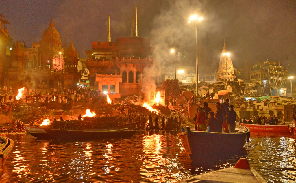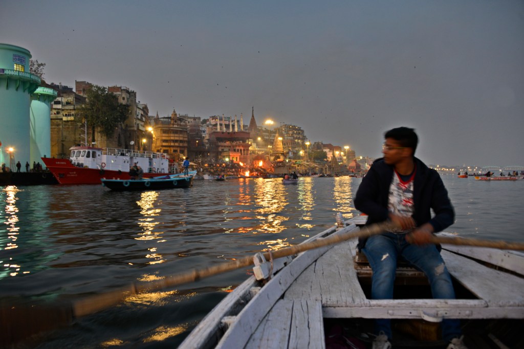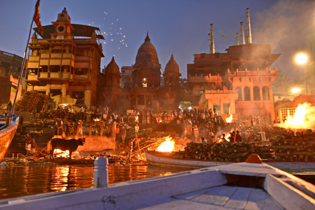 Ainda não era noite, mas a natureza pontual já fazia o Sol encostar no horizonte. Enquanto admirávamos o espetáculo, seguíamos escorregando silenciosamente na água leitosa do rio Ganges, no mesmo lugar onde pela manhã víramos o sol nascer. Passávamos por palácios, por templos, escadarias grandiosas e hindus aglomerados em ghats praticando seus rituais sagrados. Já com o céu escuro, chegávamos ao Ghat Manikarnika, o mais sagrado lugar de cremação de toda a Índia, na capital espiritual do país. O fim da tarde havia sido bastante entusiasmante com o passeio a pé pelos becos escondidos da cidade onde muitos passam seus últimos dias, e por onde os corpos são carregados em padiolas em direção ao rio para serem cremados. E embora a experiência neste dia tenha sido intensa, nada se compararia ao que estávamos por experimentar.