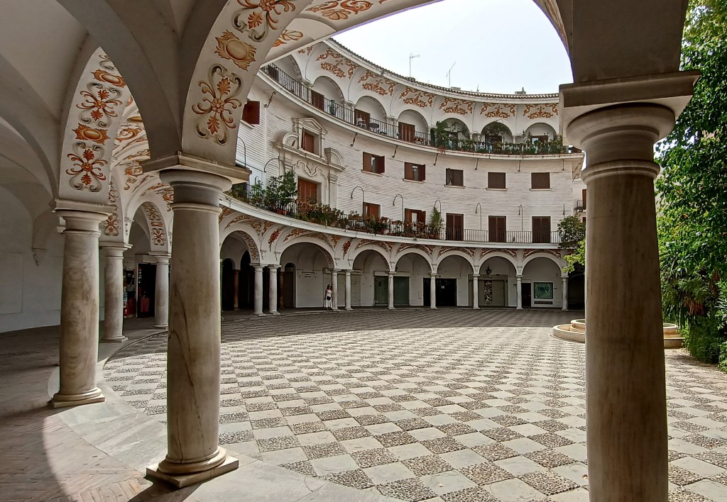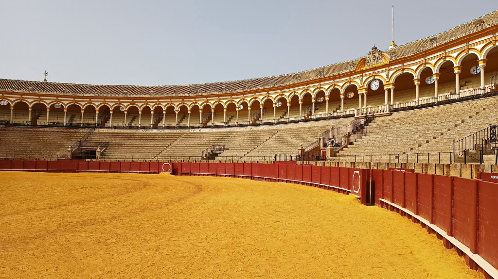 A Maestranza, plaza de toros mais antiga da Espanha, lugar polêmico, de uma arte lancinante, de morte que é vida. Não discuto, mas muito me agrada, razão por que não me arriscarei em julgamentos. Ali, em dias de luta, cinco touros têm seus momentos mais impressionantes: de preservar suas vidas, o que significa desempenhar uma bravura indômita no espetáculo e contar com o raro indulto de seu diretor ou, mais fácil, de matar ou ferir gravemente o toureiro. De outro lado, o matador, cuja única medida matar, pois jamais admite ser morto, embora arrisque-se com os cornos a perfurarem-no. Esta é a base fundamental do terrível jogo, mas Sevilha, devemos compreendê-la, é assim: sagrada e profana, passional e apaixonante, religiosa e sensual, crente e descrente.
