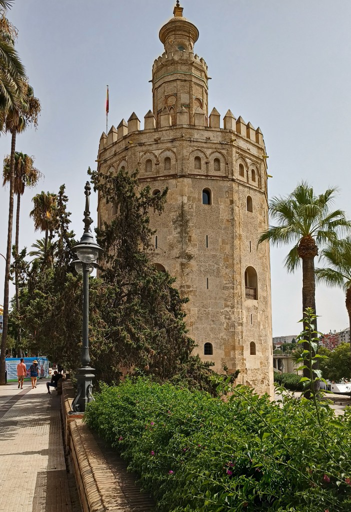 Depois, caminhamos em direção à Torre del Oro – às margens do Rio Guadalquivir – e, então, à Maestranza, plaza de toros mais antiga da Espanha. Para amanhã ficarão os tesouros mais desejados de Sevilha, cidade abarrotada de preciosidades mouriscas, mudéjares, maneiristas, renascentistas e barrocas como os Reales Alcázares, a Catedral La Giralda, o Arquivo Geral das Índias, a Casa de Pilatos, a Torre la Giralda. Depois, à bela Plaza de Espanha com o céu cinzento e pingos de chuva. Lembramo-nos do que nos dissera o motorista que nos levara do aeroporto ao hotel: “Nunca chove em Sevilha em Agosto” e rimos de sua furada previsão, sentindo alguns pingos parrudos caindo do céu sobre nós.
