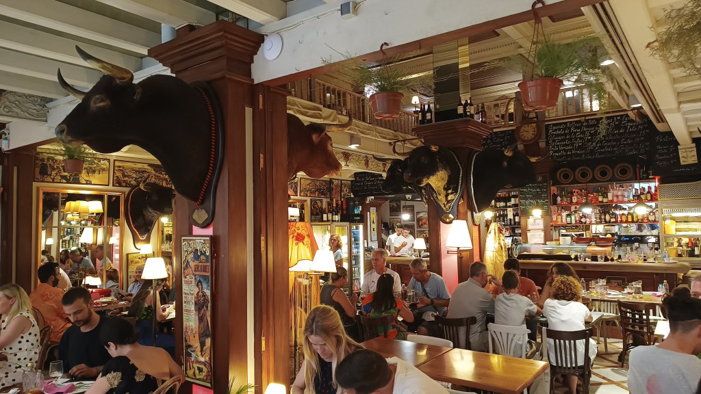 Paramos para comer num restaurante encantador. Nos sentamos entre turistas e turistas. Locais eram garçons e cozinheiros. Comemos tapas e bebemos sangria fresca. Tudo delicioso. Como Sevilha, que é sempre uma boa história, que acaba, mas nunca termina.