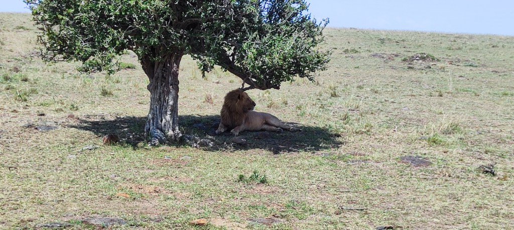 Cruzamos um pequeno rio e encontramos uma grande manada de topis. Depois, outra de búfalos e, mais adiante, uma família de hienas em volta e dentro de uma poça de lama. Seguimos os avisos do rádio e nos dirigimos até uma árvore solitária em cuja sombra descansava um leão igualmente só.