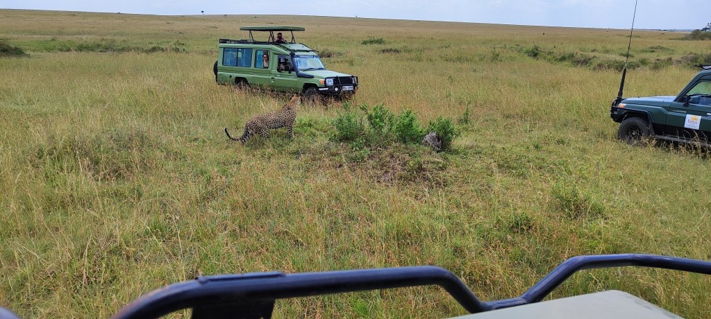 Afastava-se, sob o sol, em direção a um arbusto onde guardava uma presa que aquelas hienas tentavam roubar. Seguimos e avistamos elefantes, mais adiante um belíssimo leopardo em movimento e pulando sobre um pequeno lago. Nos aproximamos e o vimos bem de perto, ao ponto de notarmos uma pelagem intacta de um animal jovem e saudável.