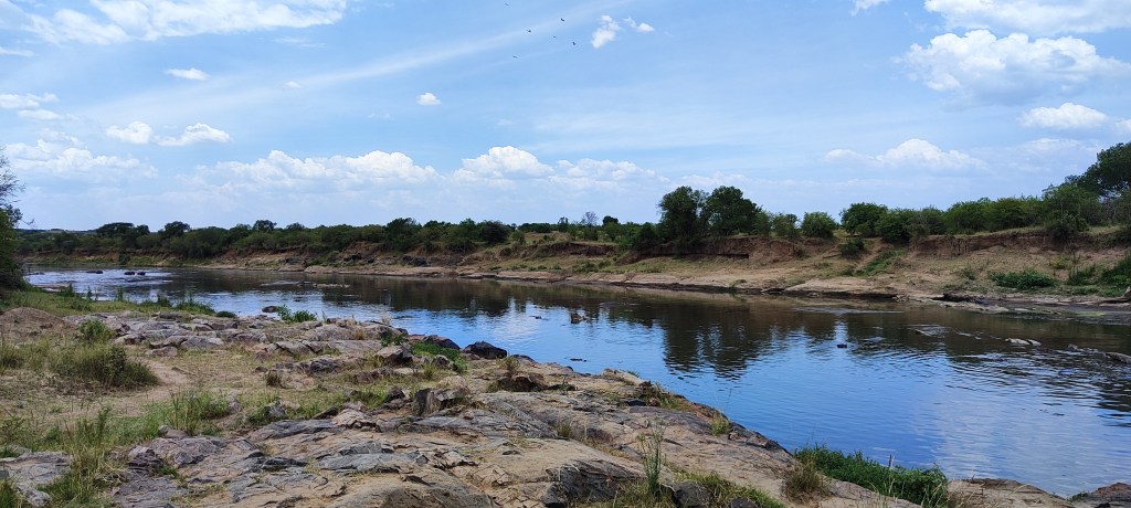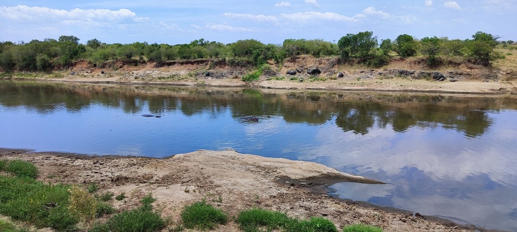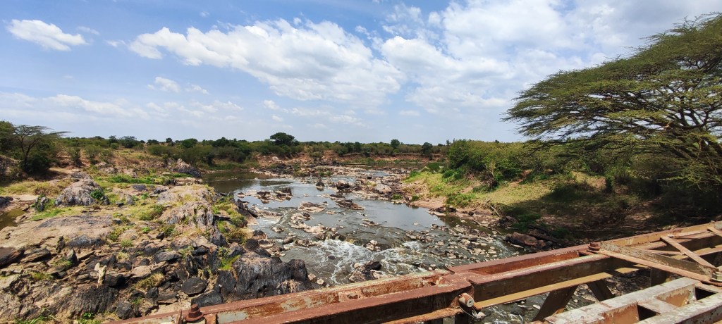 Estávamos próximos à divisa do Quênia com a Tanzânia, onde o Masai Mara passa a chamar-se Serengueti. Estacionamos os jipes na margem queniana do Rio Mara, num dos pontos onde ocorre a frenética travessia dos gnus na Grande Migração, defronte ao Hippo Pool Viewpoint, onde avistamos a maior concentração daqueles animais. Descemos dos carros, passamos pela ponte Purungat até o Sekenani Gate e fizemos uma caminhada pela margem do rio, acompanhados de guardas armados, num lugar chamado Condado de Narok, a poucos passos do território tanzaniano.