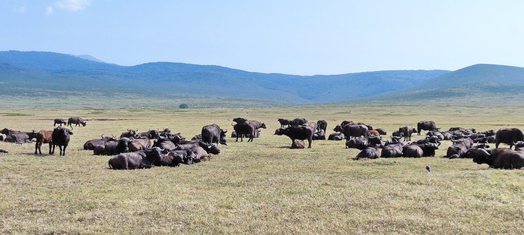 Quando chegamos embaixo, o lugar já dava sinais da plenitude de seu potencial. Em vida animal e paisagens. Os pequenos pontos pretos que avistáramos de cima, transformavam-se em formidáveis manadas de búfalos, de zebras e gnus estendendo-se por todo o plano da cratera. E logo, leões!