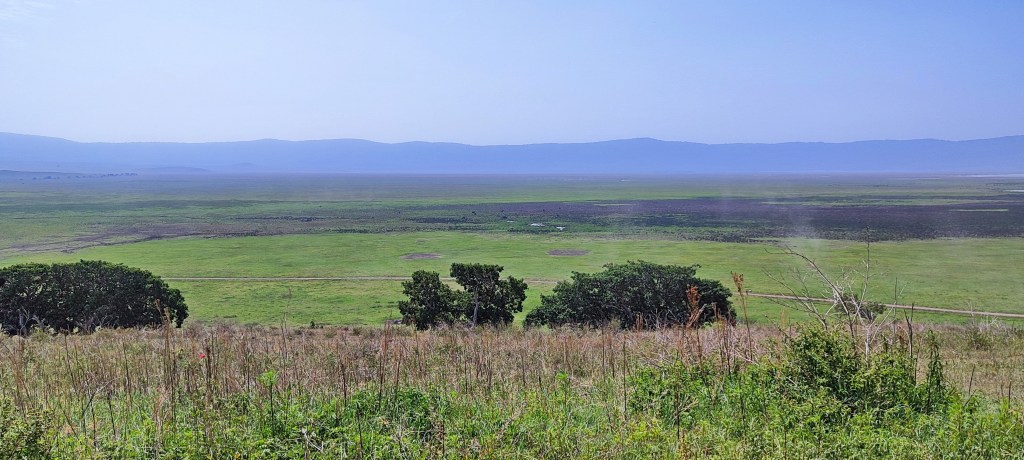 Foi assim a primeira vez que avistei a Cratera Ngorongoro. Embora de tirar o fôlego vista assim do alto, parecia o céu no chão. Sem graça para um chão, sei lá. Quem esperava encontrar a Arca de Noé, a primeira visão de um chão liso e descolorido, quase estéril, manchado por lagos com não mais que dois ou três tons de verde, de uns meros sinais de exemplares da vida animal percorrendo a imensidão, não parecia tão exuberante, desde o mirante Crater ViewPoint.